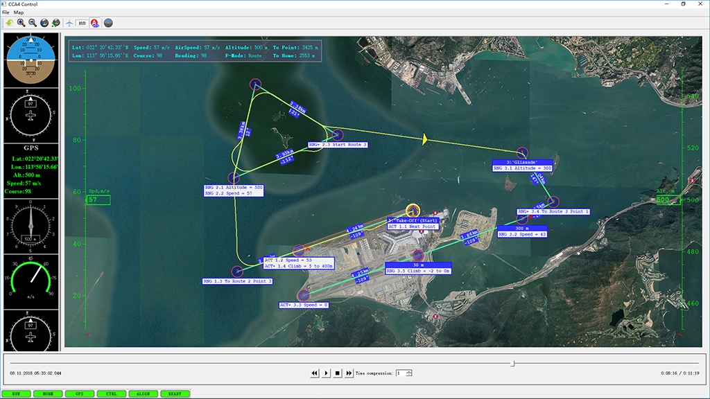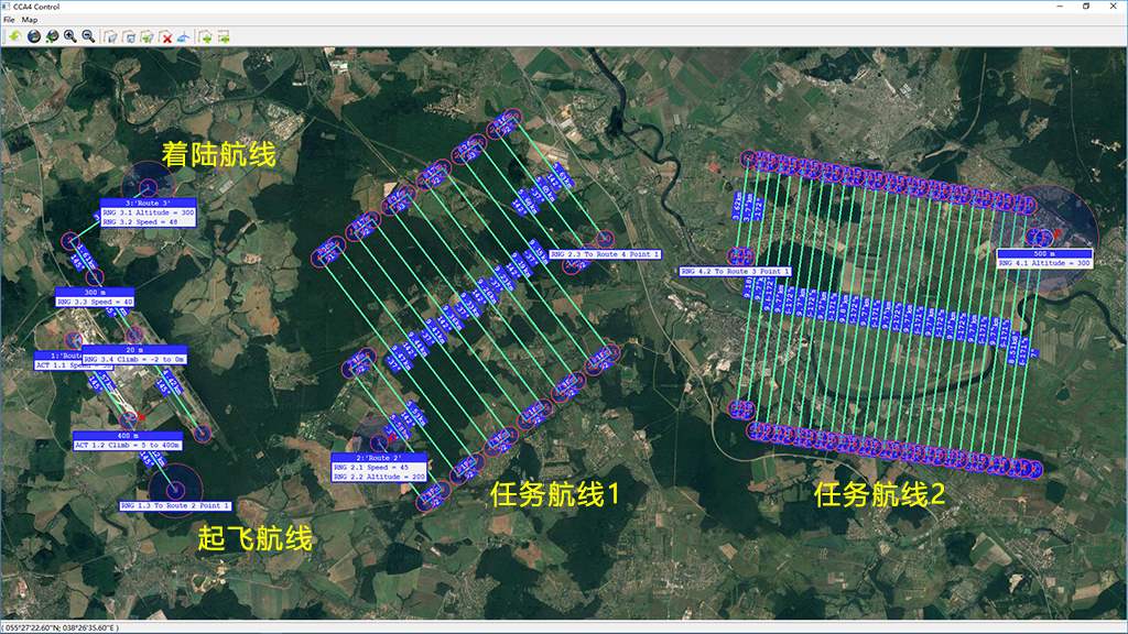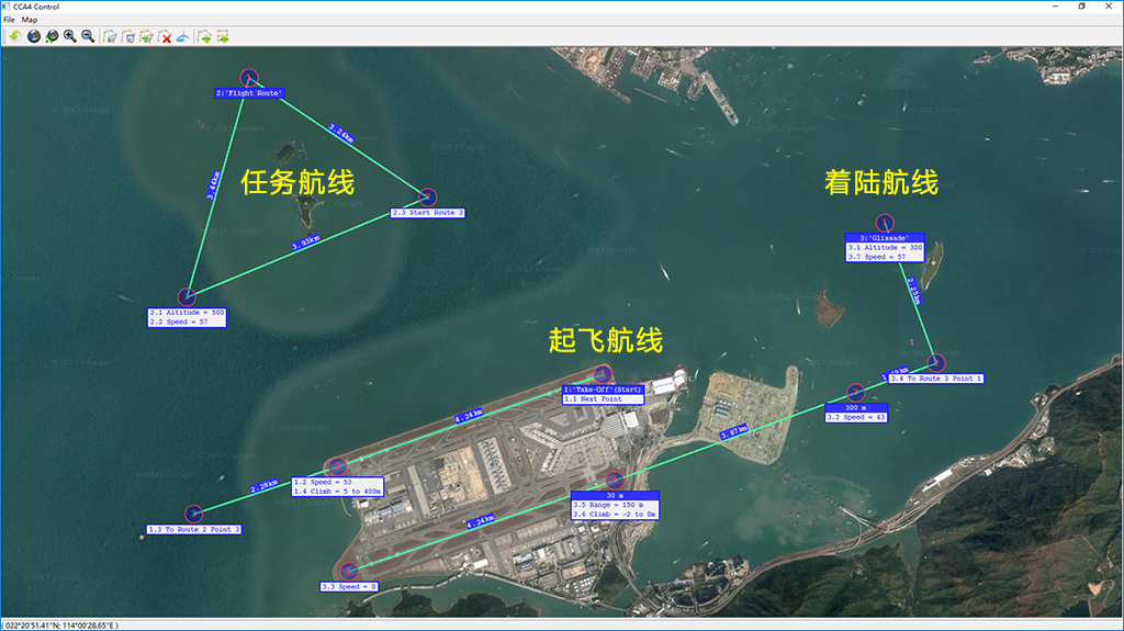 飞行控制系统的地面飞行控制软件支持多种地图格式和在线地图,能够规划各种复杂的任务航线,可以个性化设置控制和显示方式、自定义添加控制按钮和交互窗口、方便灵活的实时航行控制、