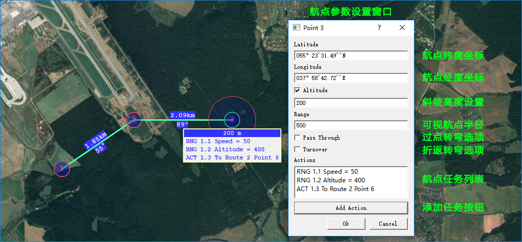 每条航线可设置 1000 个航点,每个航点可定义 23 项参数和 18 项任务操作。