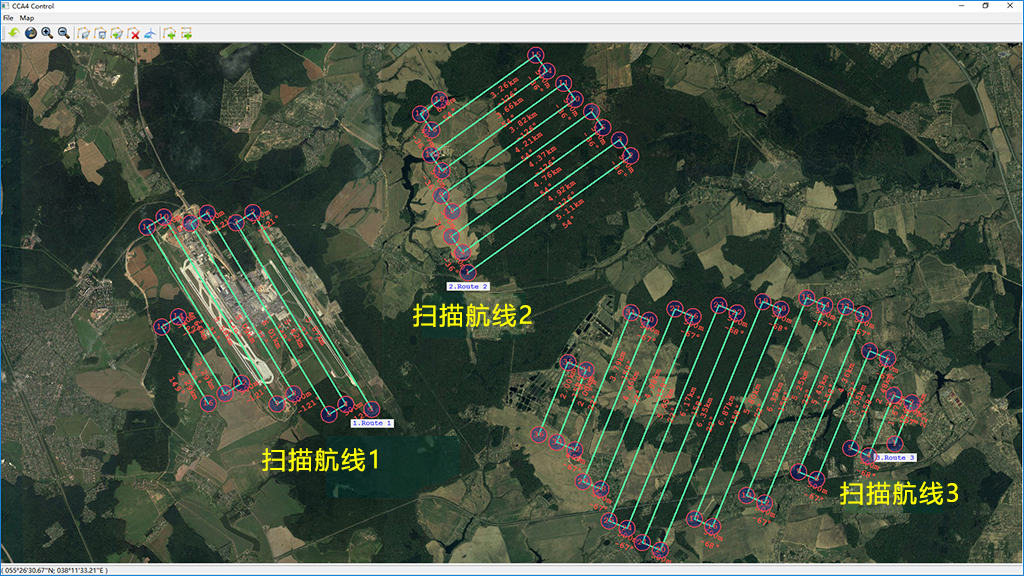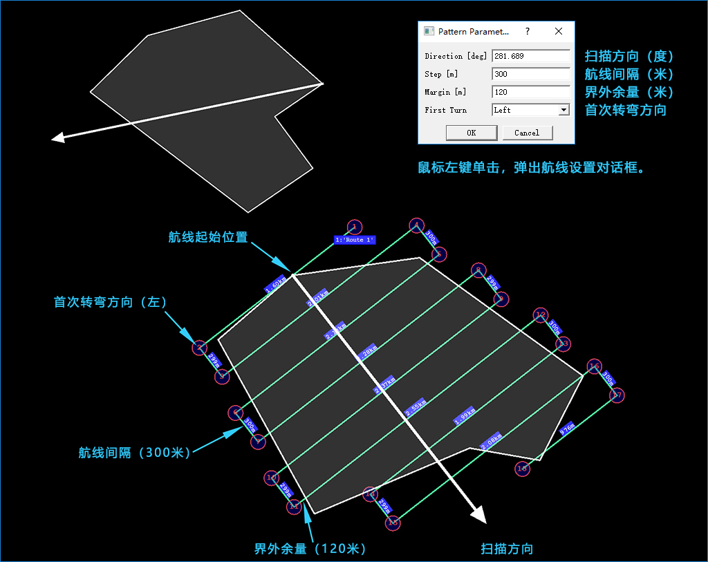 多边形扫描航线,可定义航线扫描方向、航线间隔、界外余量、转弯方向等。