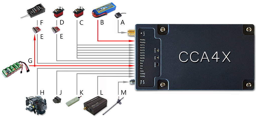 A.GPS天线、B.飞控电源、C.D舵机、E.SBUS_PPM_PWM转换器、F.遥控接收机、G.舵机电源、H.转速传感器、J.CAN总线传感器、K.飞行数据记录器、L.数传电台、M.空速管